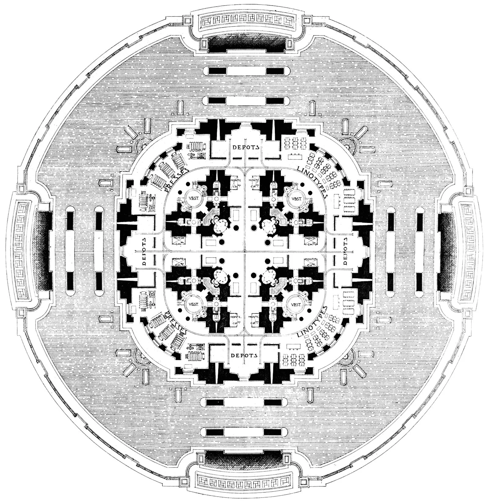 The Science Group has for its crowning motif a gigantic Tower of Progress. This tower, planned on lines of practical utility, is capable of providing offices for those international societies recognised as beneficial to humanity and to the progress of the world, as well as for the World Press and a great station of wireless telegraphy. The Tower rises in the midst of a circular space set aside for Industrial and Scientific Congress buildings. This group includes buildings which will be dedicated respectively to Medicine, Surgery and Hygiene, Law and Criminology, Electricity and Inventions, Agriculture and Transportation … These buildings form what is known as Congress Square, and the Tower of Progress, rising in their midst, is the heart of both the International Centre and the City.[1]